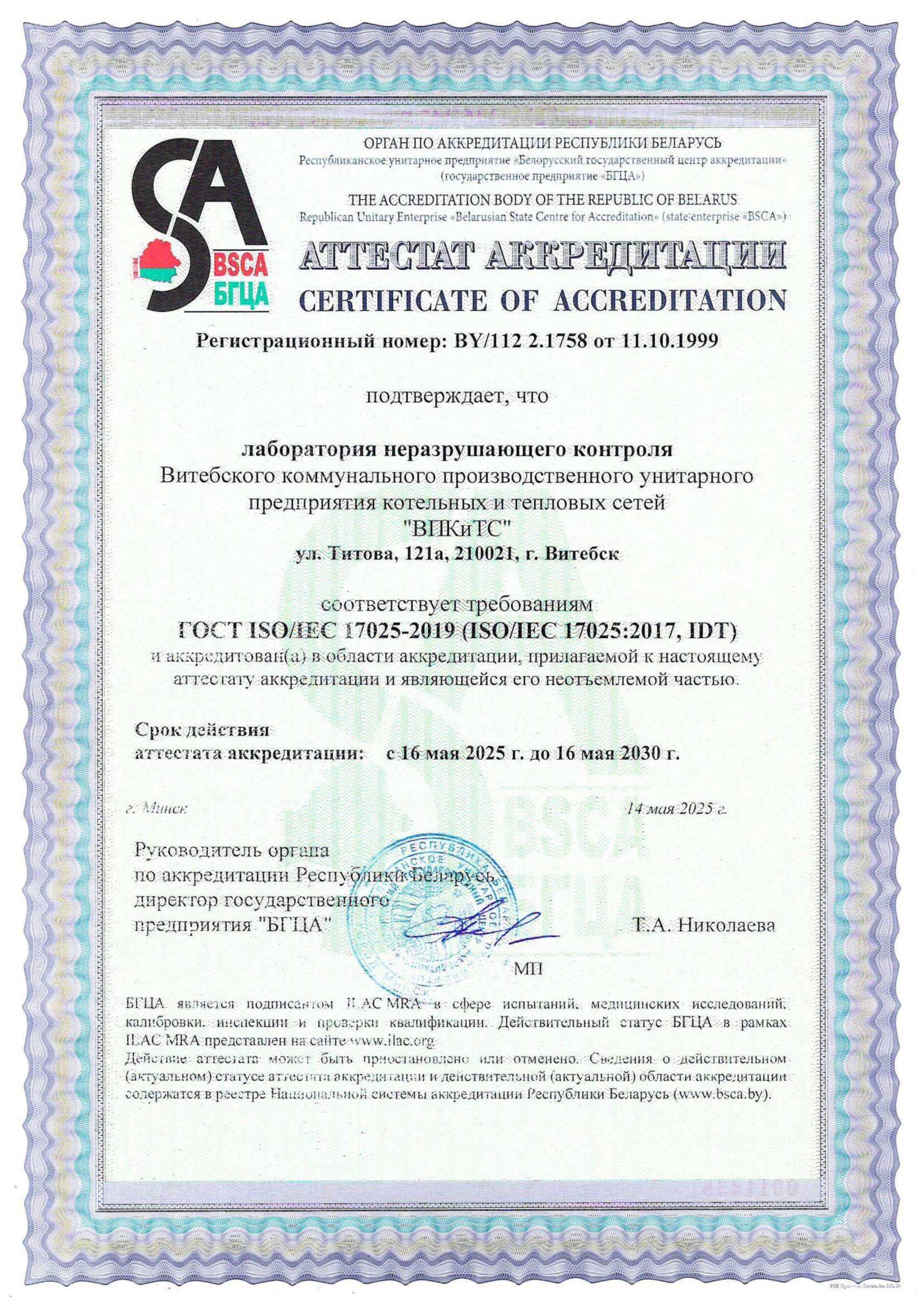 Лаборатория аккредитована на техническую компетентность в соответствии с требованиями ГОСТ ISO/IEC 17025-2019 (переход на новую версию основополагающего стандарта осуществлен 16.05.2020г.). Аттестат аккредитации BY/112 2.1758 от 11.10.1999 г. Актуальную информацию по аттестату аккредитации можно найти в Реестре Национальной системы аккредитации Республики Беларусь в разделе Аккредитованные испытательные лаборатории.